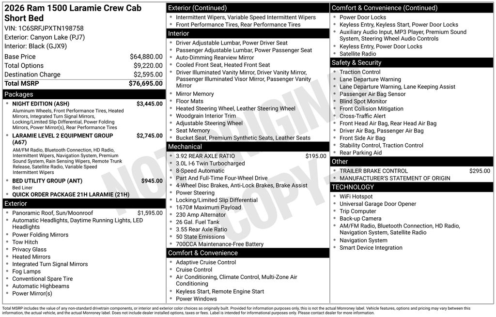 Whether you're tackling tough terrain or cruising down the highway, the 2026 Ram 1500 Laramie is a true standout in the full-size pickup segment. With its impressive capabilities, premium features, and striking good looks, this truck is sure to exceed your expectations. Visit our showroom today to experience the Laramie for yourself and discover how it can elevate your driving experience. Price includes: $2000 - 2026 National SFS Lease Loyalty Bonus Cash . Exp. 04/30/2026 $3500 - 2026 National Retail Bonus Cash . Exp. 04/30/2026 $500 - 2026 Great Lakes BC Bonus Cash . Exp. 04/30/2026 $500 - 2026 National 2026 Military Bonus Cash . Exp. 01/04/2027