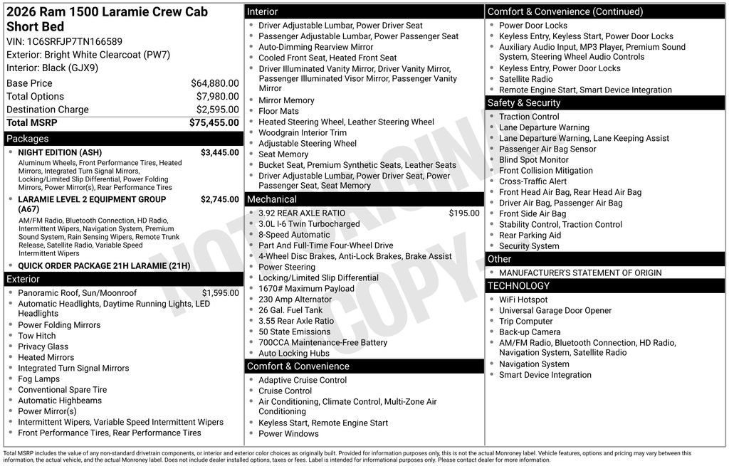 Discover the perfect balance of power, technology, and luxury in this 2026 Ram 1500 Laramie. With a city fuel economy of 17 mpg and a highway rating of 24 mpg, this truck delivers impressive efficiency without compromising its impressive performance. Experience the difference for yourself and schedule a test drive today. Price includes: $2000 - 2026 National SFS Lease Loyalty Bonus Cash . Exp. 04/30/2026 $3500 - 2026 National Retail Bonus Cash . Exp. 04/30/2026 $500 - 2026 Great Lakes BC Bonus Cash . Exp. 04/30/2026 $500 - 2026 National 2026 Military Bonus Cash . Exp. 01/04/2027
