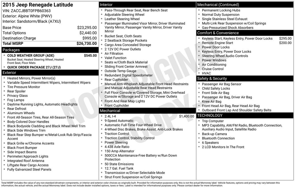 We have a 2015 Renegade w/ the 1.4L turbo engine & 6-speed manual in the Latitude package. Silver w/ tan interior. It has heated seats & steering wheel, which is great in NY winters. We’ve had 4 adults comfortably on multiple road trips, averaging 37-38 mpg. Oil changes & gas can be pricey bc it req’s European grade synthetic oil and high octane. But w/ the mileage it gets and surprising amount of interior room, I love this Jeep. And now it’s approaching the age where I can start adding a small lift and tires