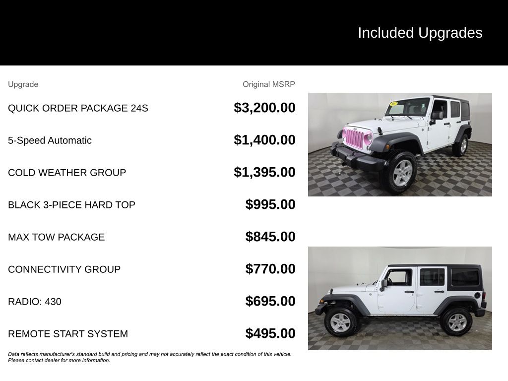 This Wrangler also comes equipped with the Quick Order Package 24S, Cold Weather Group, Max Tow Package, Connectivity Group, and a Black 3-Piece Hard Top. Whether you're conquering the trails or cruising the city streets, this Wrangler Unlimited Sport delivers the perfect blend of capability, technology, and style.