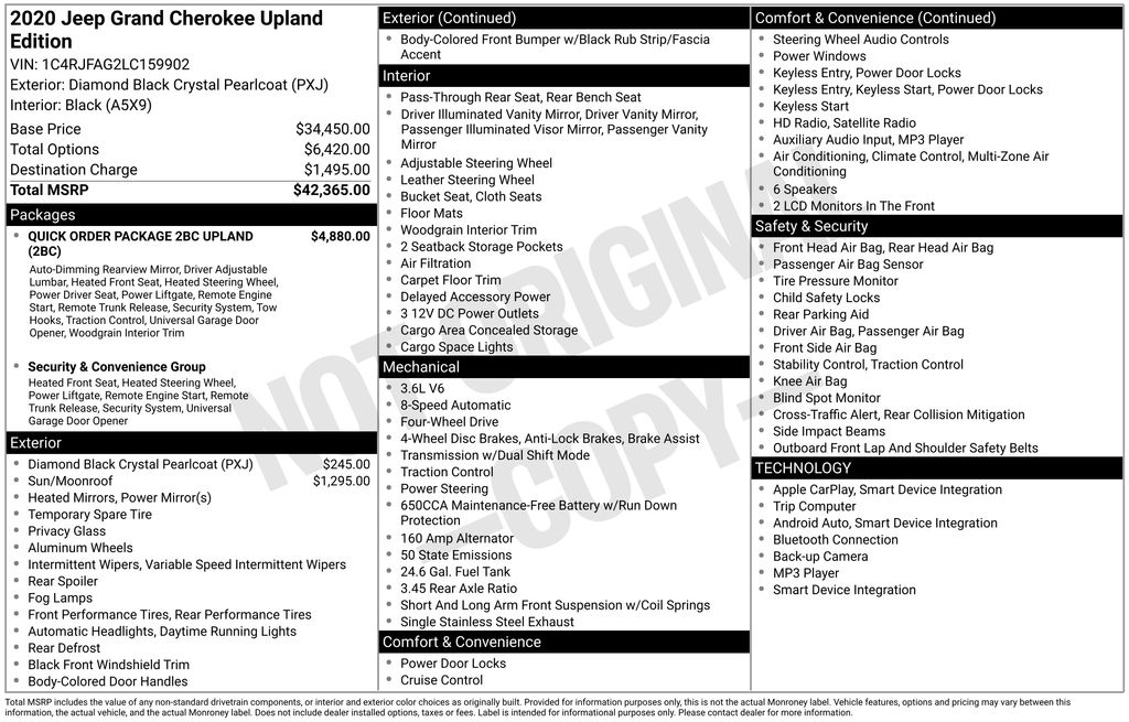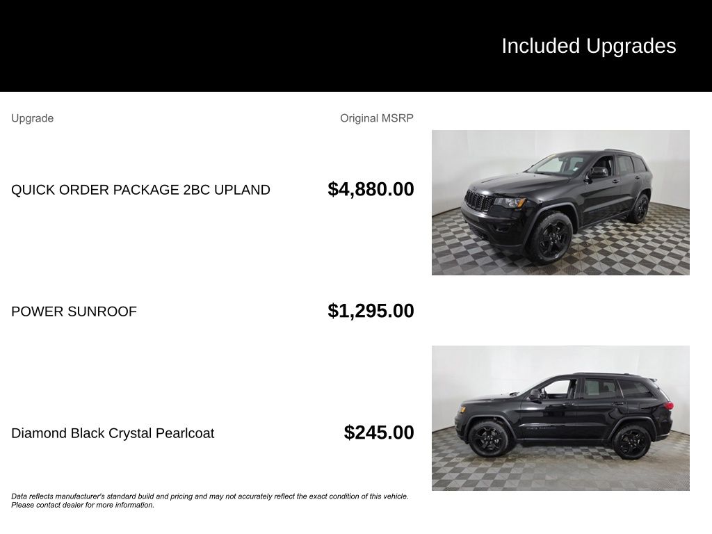 Grand Cherokee Upland Edition Diamond Black Crystal Pearlcoat 3.6L V6 24V VVT Grand Cherokee Upland Edition, 4D Sport Utility, 3.6L V6 24V VVT, 8-Speed Automatic, 4WD, Diamond Black Crystal Pearlcoat, Black Cloth, Apple CarPlay/Android Auto, Auto-Dimming Rear-View Mirror, Automatic temperature control, Blue-Accent Badges, Dark Day Light Opening Moldings, Dark Headlamp Bezel Finish, Dark Lens Taillamps, Front fog lights, Fully automatic headlights, Gloss Black Exterior Accents, Gloss Black Grille w/Black Honeycomb, Gloss Black Rear Fascia Applique, Gloss Black Roof Rails, Jeep Black Gloss Badging, Liquid Titanium Accents, ParkView Rear Back-Up Camera, Power 4-Way Driver Lumbar Adjust, Power 8-Way Driver/Manual Passenger Seat, Power Sunroof, Quadra-Trac II 4WD System, Quick Order Package 2BC Upland, Rear Fascia Black MIC Step Pad, Security & Convenience Group, Steering Wheel Mounted Audio Controls, Steering wheel mounted audio controls, Telescoping steering wheel, Tilt steering wheel, Tow Hooks, Wheels: 17" x 8.0" Silver Aluminum, Wheels: 20" x 8.0" Gloss Black Painted Aluminum.