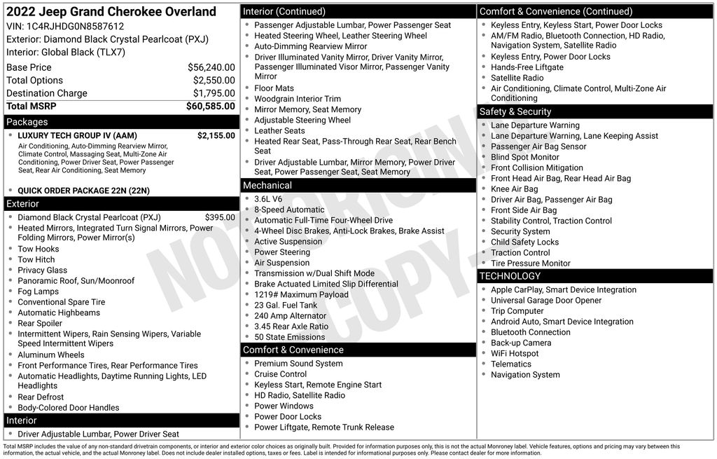 Grand Cherokee Overland Diamond Black Crystal Pearlcoat Priced below KBB Fair Purchase Price! Odometer is 34418 miles below market average! 3.6L V6 24V VVT Grand Cherokee Overland, 4D Sport Utility, 3.6L V6 24V VVT, 8-Speed Automatic, 4WD, Diamond Black Crystal Pearlcoat, Global Black Leather, 12-Way Power Adjust Driver Seat, 12-Way Power Adjust Front Passenger Seat, 2nd-Row Manual Window Shades, ATC w/4-Zone Temp Control, Auto-leveling suspension, Heated front seats, Heated rear seats, Heated steering wheel, Luxury Tech Group IV, Nappa Leather Seats w/AAM, Passenger Seat Memory, Power Driver Seatback Massage, Power Front Passenger Seatback Massage, Power Liftgate, Power moonroof, Rain sensing wipers, Rearview Autodim Digital Display Mirror, Ventilated front seats, Wheels: 20" x 8.5" Machined Face Aluminum, Wireless Charging Pad. 19/26 City/Highway MPG