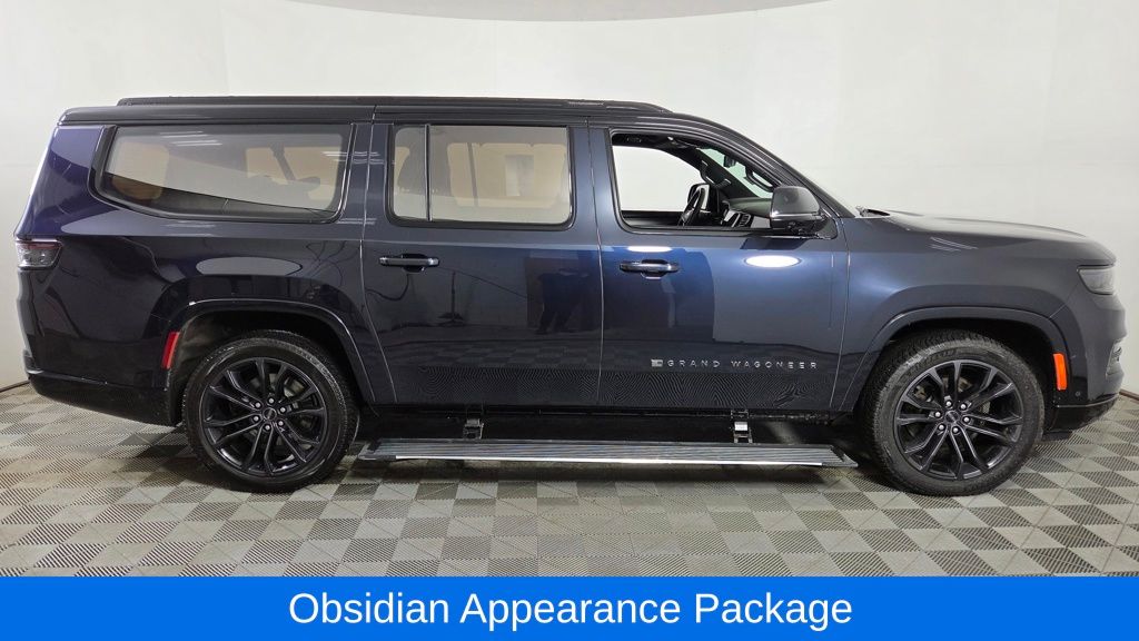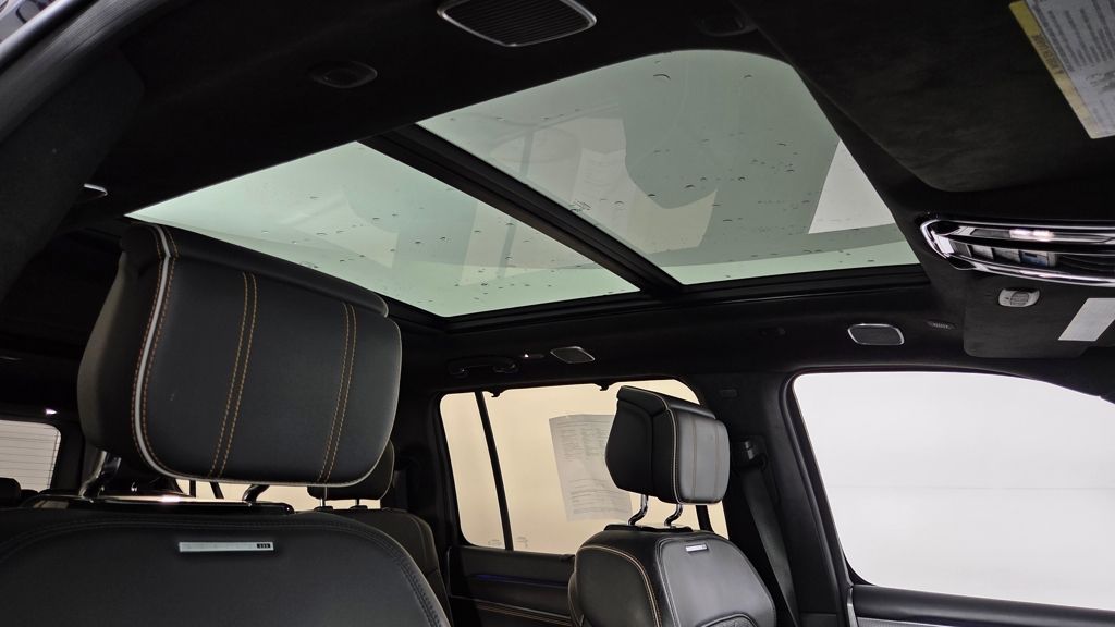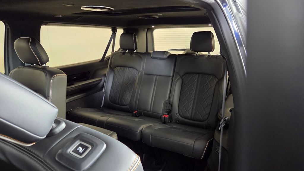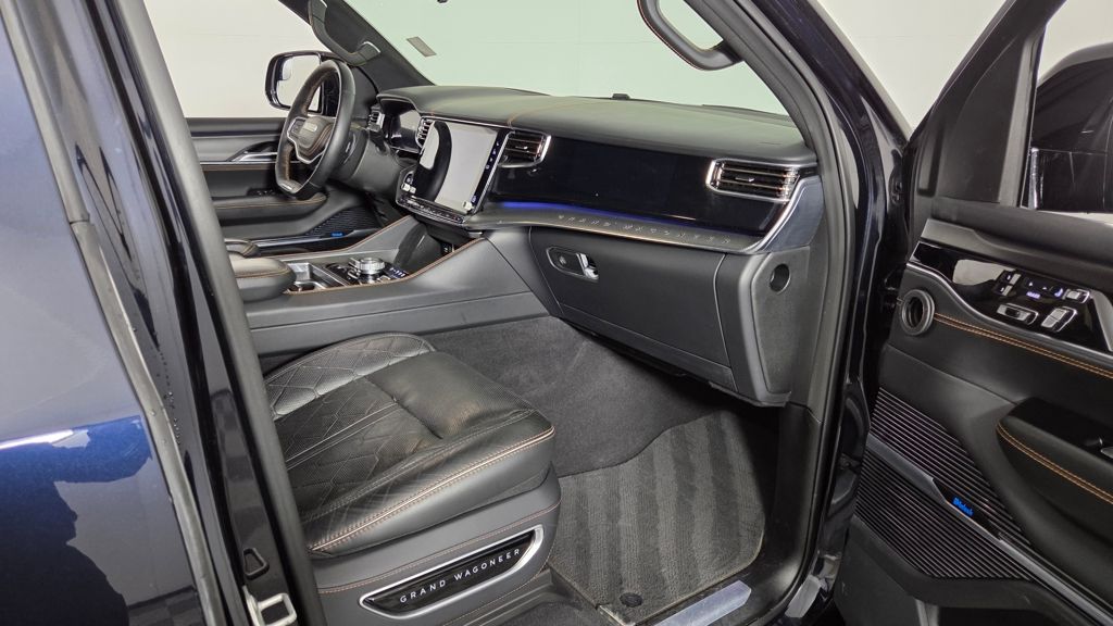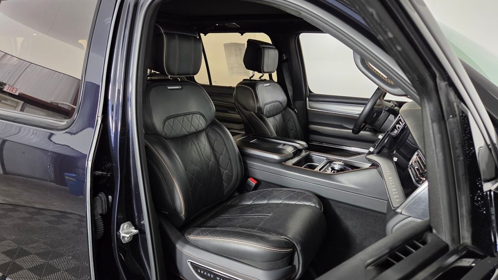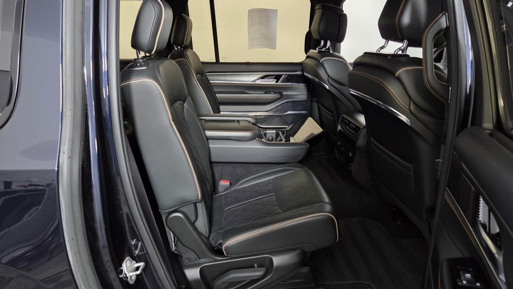 The exterior of this Grand Wagoneer L is a study in elegant sophistication, with a striking Midnight Sky Blue paint scheme complemented by the Obsidian Appearance Package's bold black accents. Step inside, and you'll be enveloped in a cabin that seamlessly blends premium materials, advanced technology, and unparalleled comfort.