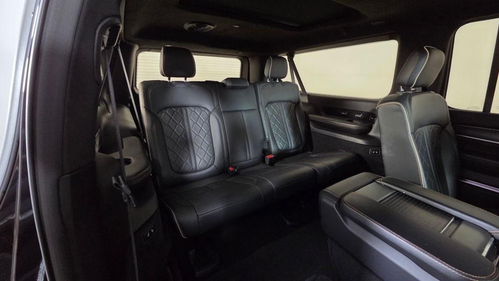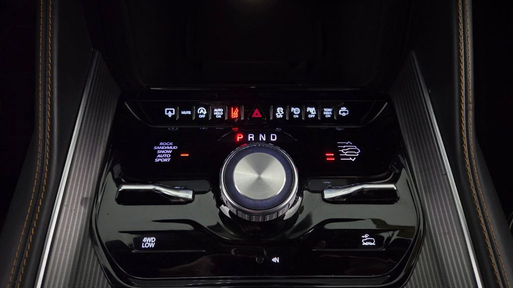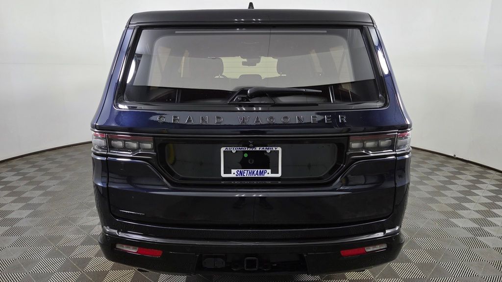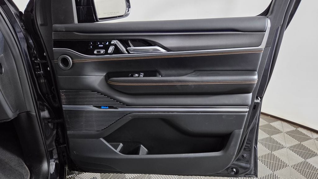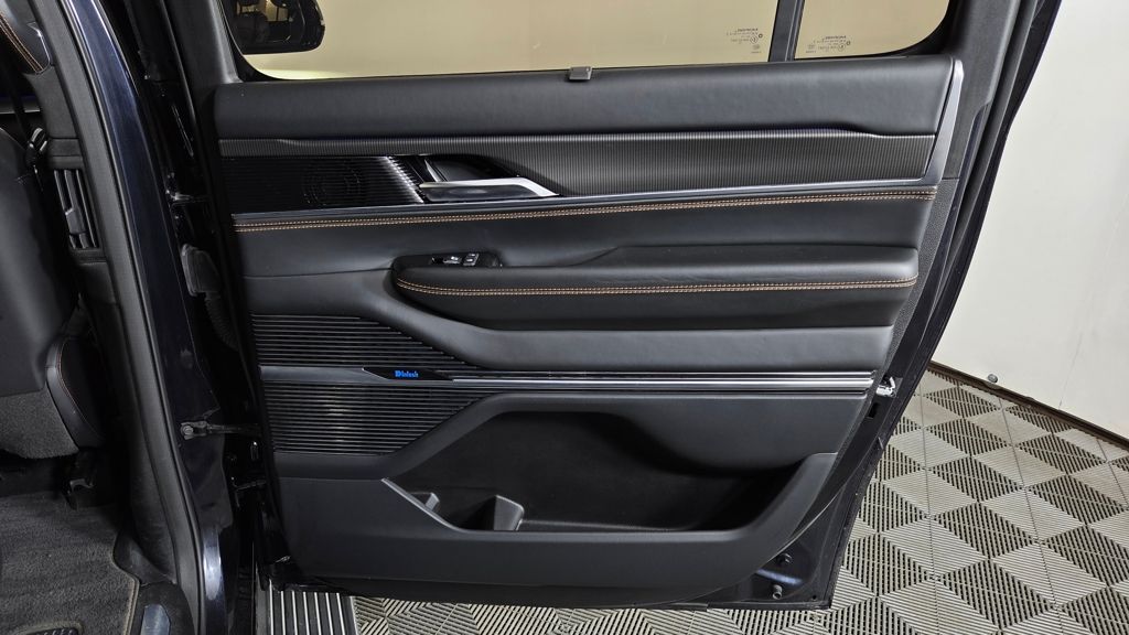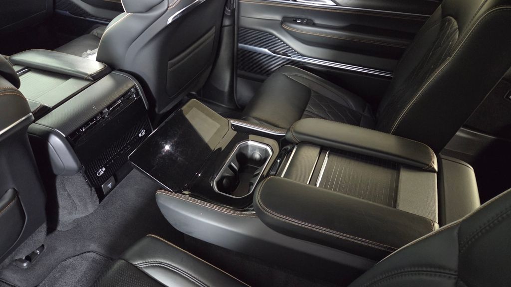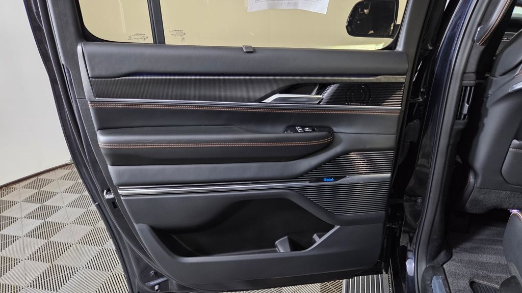 The exterior of this Grand Wagoneer L is a study in elegant sophistication, with a striking Midnight Sky Blue paint scheme complemented by the Obsidian Appearance Package's bold black accents. Step inside, and you'll be enveloped in a cabin that seamlessly blends premium materials, advanced technology, and unparalleled comfort.