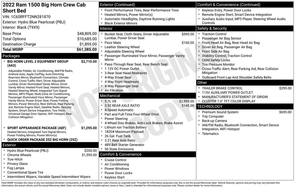 Recent Arrival! 1500 Big Horn/Lone Star Hydro Blue Pearlcoat HEMI 5.7L V8 Multi Displacement VVT 1500 Big Horn/Lone Star, 4D Crew Cab, HEMI 5.7L V8 Multi Displacement VVT, 8-Speed Automatic, 4WD, Hydro Blue Pearlcoat, Black Cloth, 115V Auxiliary Power Outlet, 115V Auxiliary Rear Power Outlet, 2nd Row In Floor Storage Bins, 4G LTE Wi-Fi Hot Spot, 8.4" Touchscreen Display, Air Conditioning ATC w/Dual Zone Control, All Plant-Installed Decals, Apple CarPlay, Auto-Dimming Exterior Driver Mirror, Auto-Dimming Rear-View Mirror, Big Horn Badge, Big Horn Level 2 Equipment Group, Black Exterior Mirrors, Black Interior Accents, Black Premium Power Mirrors, Bluetooth Handsfree Phone & Audio, Body Color Exterior Mirrors, Body Color Front Bumper, Body Color Premium Power Mirrors, Body Color Rear Bumper w/Step Pads, Bridgestone Brand Tires, Class IV Receiver Hitch, Cluster 7.0" TFT Color Display, Connectivity - US/Canada, Convex Wide-Angle Mirror Insert, Deluxe Cloth Bucket Seats, Exterior Mirrors Courtesy Lamps, Exterior Mirrors w/Heating Element, Exterior Mirrors w/Supplemental Signals, For Details, Visit DriveUconnect.com, Front fog lights, Fully automatic headlights, Global Telematics Box Module (TBM), Glove Box Lamp, Google Android Auto, GPS Antenna Input, Heated Front Seats, Heated Steering Wheel, Integrated Center Stack Radio, Media Hub w/2 Charge Only USBs, ParkSense Front/Rear Park Assist w/Stop, ParkView Rear Back-Up Camera, Power 2-Way Driver Lumbar Adjust, Power 8-Way Driver Seat, Power Adjustable Pedals, Power-Folding Mirrors, Quick Order Package 25Z Big Horn, Radio: Uconnect 5 W w/8.4" Display, Rear Dome w/On/Off Switch Lamp, Rear Power Sliding Window, Rear Window Defroster, Remote Start System, Security Alarm, SiriusXM Radio Service, SiriusXM Satellite Radio, Sport Appearance Package, Sport Decal, Sun Visors w/Illuminated Vanity Mirrors, Telescoping steering wheel, Tilt steering wheel, Trailer Brake Control, Universal Garage Door Opener, USB Host Flip, Wheels: 20" x 9" Aluminum Chrome Clad (WRK).